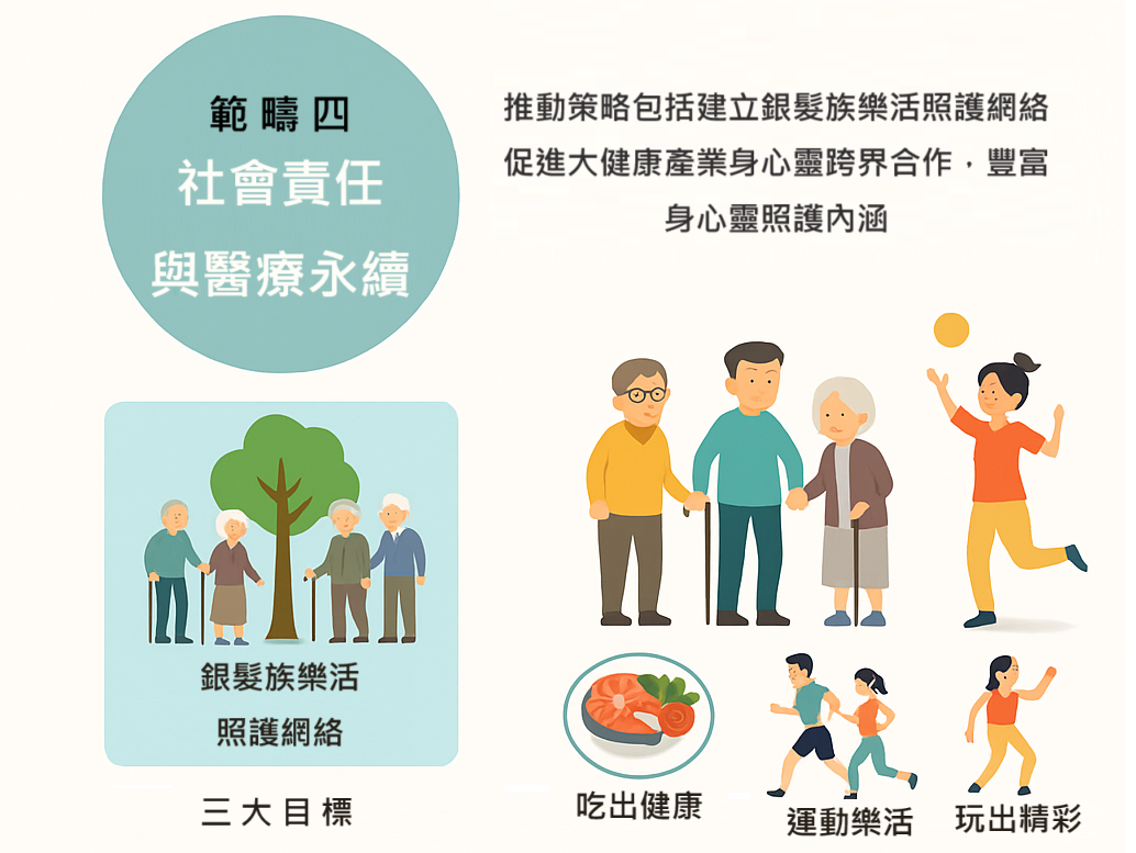 範疇四著重於社會責任與醫療永續發展,強調以社區醫療為基礎,整合照護體系,營造健康生活型態。 推動策略包括建立銀髮族樂活照護網絡,促進大健康產業身心靈跨界合作,豐富身心靈照護內涵,實現吃出健康、運動樂活、玩出精彩三大目標。.
