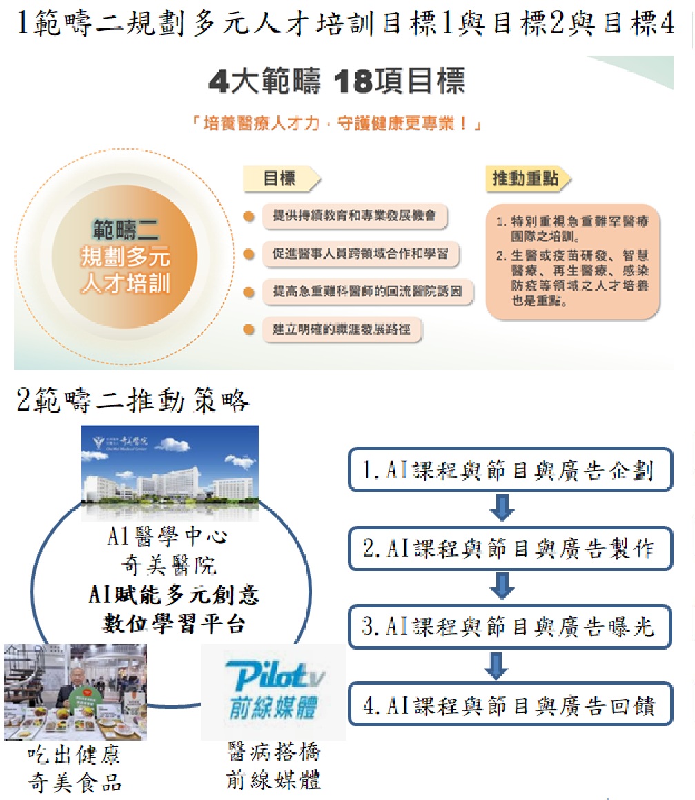計畫包含目標1、目標2及目標4的執行策略,透過系統化的培訓體系,培養醫療專業人員的綜合能力,以應對未來醫療環境的挑戰。