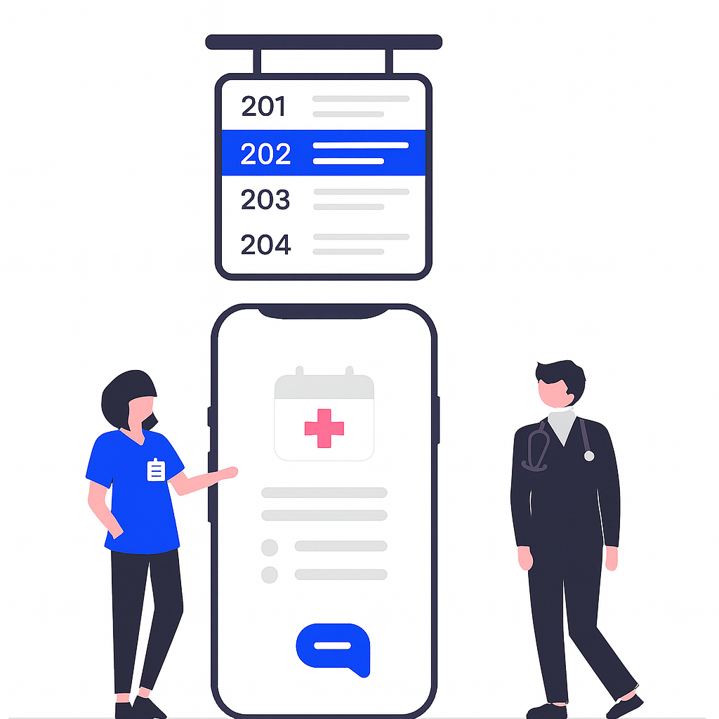 MediaCare APP 與診所後台系統整合,讓病患可透過手機完成預約、即時掌握看診進度,搭配 LINE 通知與廣告互動,提高診所服務效率與病患滿意度。